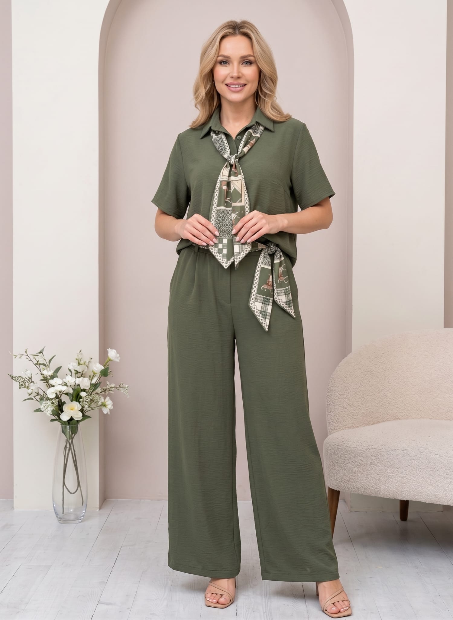 Acest compleu elegant pentru damă este ideal pentru femeile care apreciază stilul și confortul zilnic. Continuă cu o croială lejeră care avantajează siluetele generoase și oferă libertate de mișcare. Materialul este moale și plăcut la atingere, fiind potrivit pentru purtare îndelungată. Bluza are un design simplu, dar rafinat, completat de un accesoriu tip eșarfă elegantă. Acest detaliu adaugă un plus de stil și unicitate întregii ținute. Croiala bluzei permite o așezare naturală și confortabilă pe corp. Pantalonii largi completează perfect outfitul și alungesc vizual silueta. Talia elastică oferă fixare confortabilă fără presiune sau disconfort. Nuanța maro este versatilă și ușor de integrat în garderobă. Întregul compleu oferă un echilibru perfect între eleganță și lejeritate.