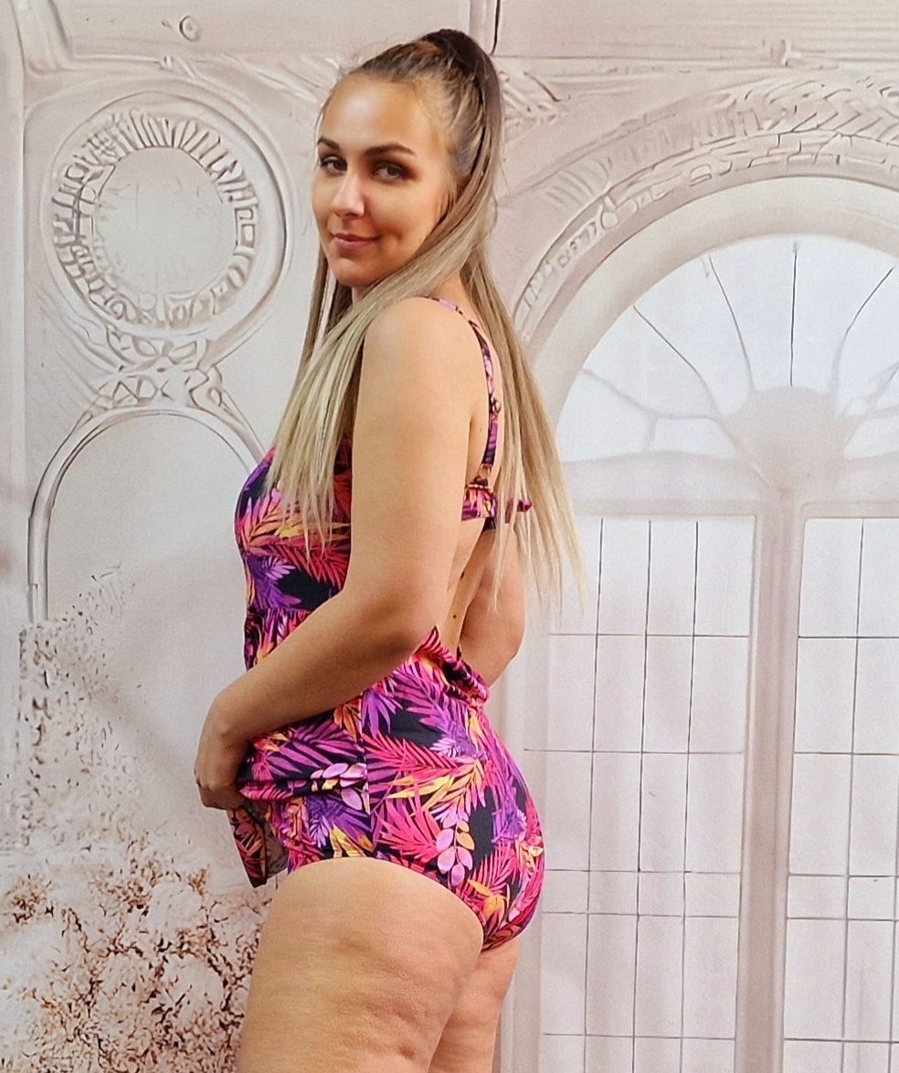 Costumul de baie cu rochie atașată este alegerea perfectă pentru femeile care doresc să se simtă confortabil. Dar si încrezătoare și frumoase pe plajă sau la piscină. Creat special pentru mărimi mari, acest model îmbină eleganța unei rochii vaporoase cu siguranța și susținerea unui costum de baie clasic. Bustul este bine susținut, iar materialul de calitate asigură libertate de mișcare și acoperire acolo unde ai nevoie.