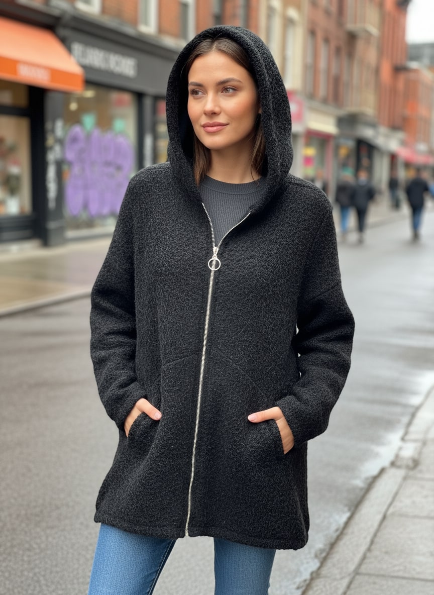 Descoperă jacheta ideală pentru sezonul rece! Această jachetă cu buzunare oversize călduroasă lejeră negru este perfectă pentru femeile care își doresc să îmbine eleganța cu confortul zilnic. Croiala lejeră asigură libertate de mișcare.Iar materialul moale și plăcut la atingere oferă o senzație de căldură plăcută în zilele friguroase de toamnă și iarnă.